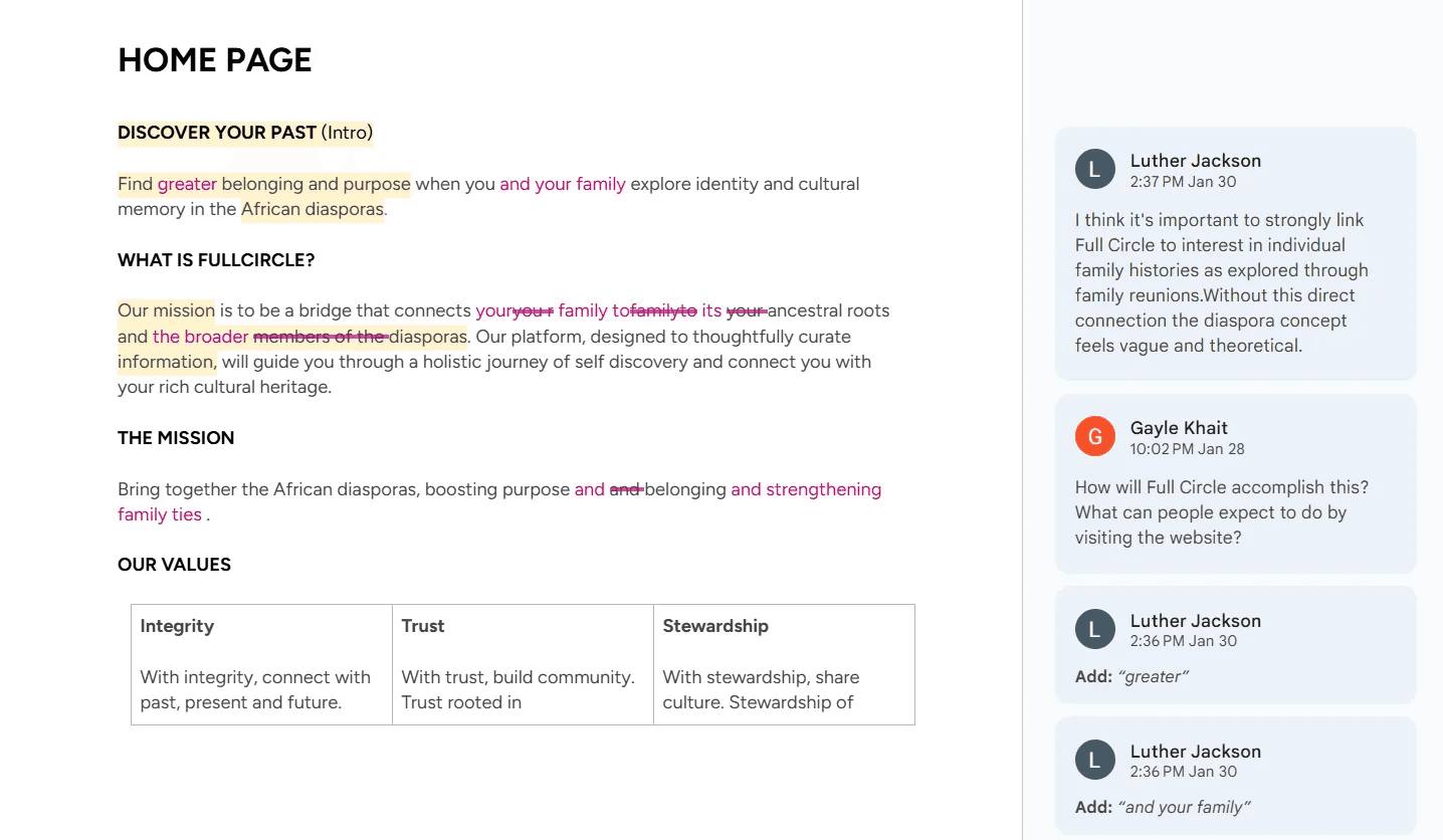 Stakeholders collaboratively edited the website copy in a shared Google Doc.
