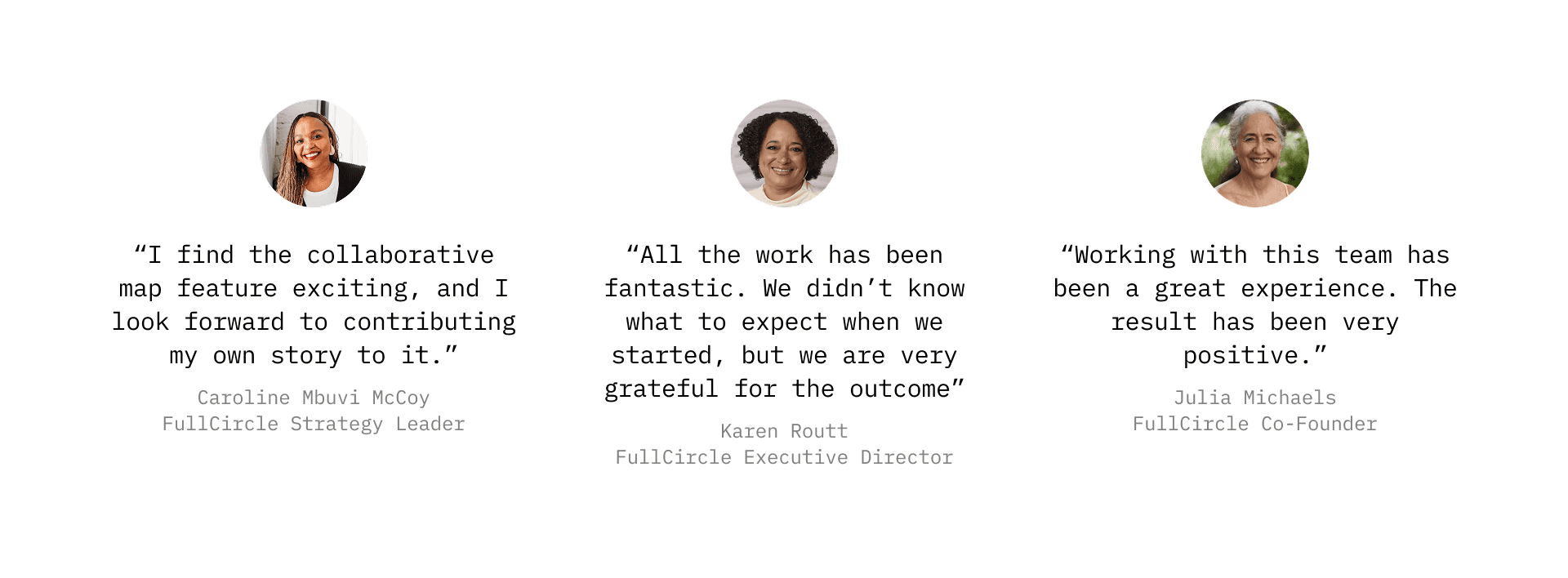 Testimonials from FullCircle's Co-Founder, Executive Director, and Strategy Leader