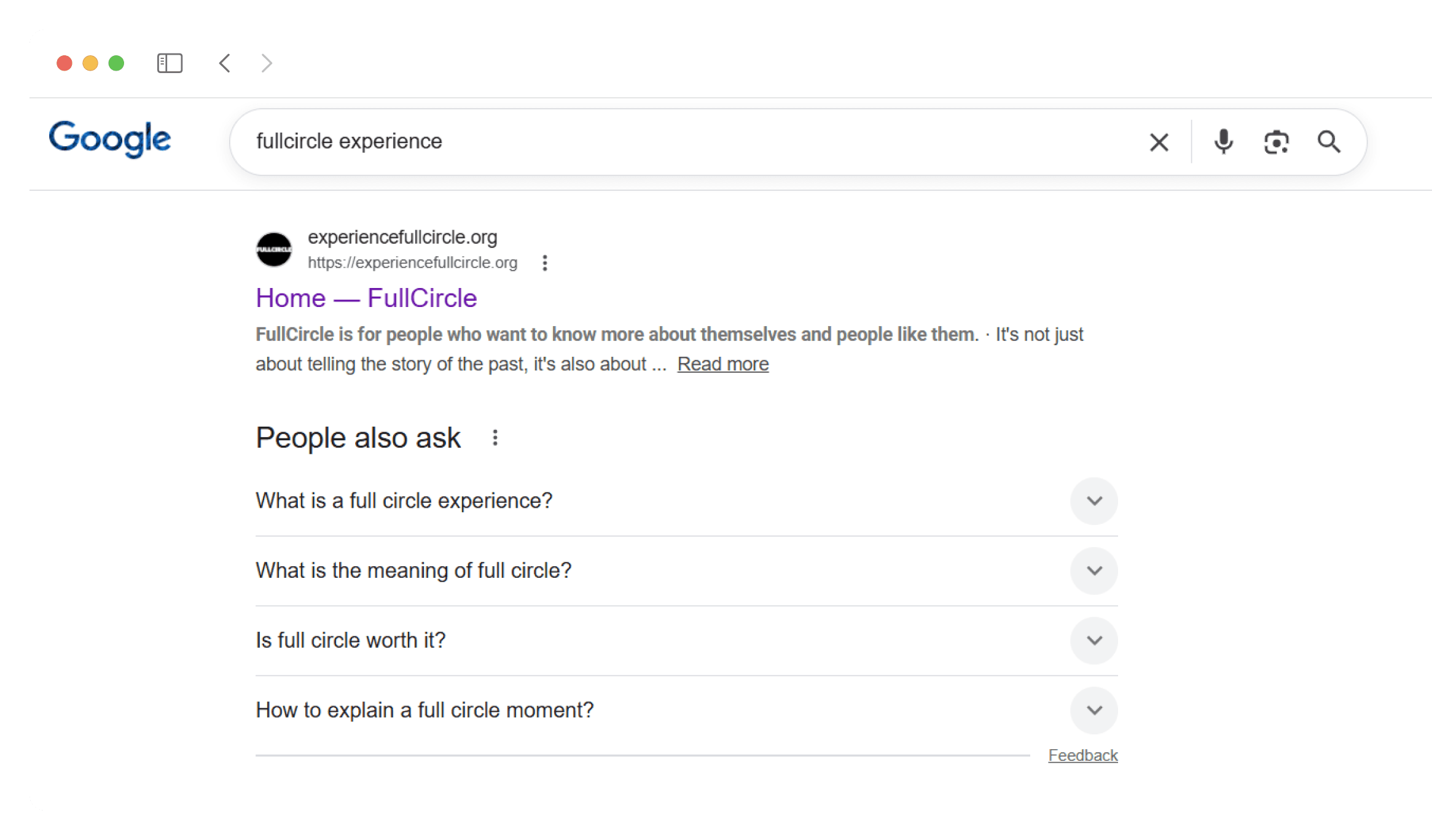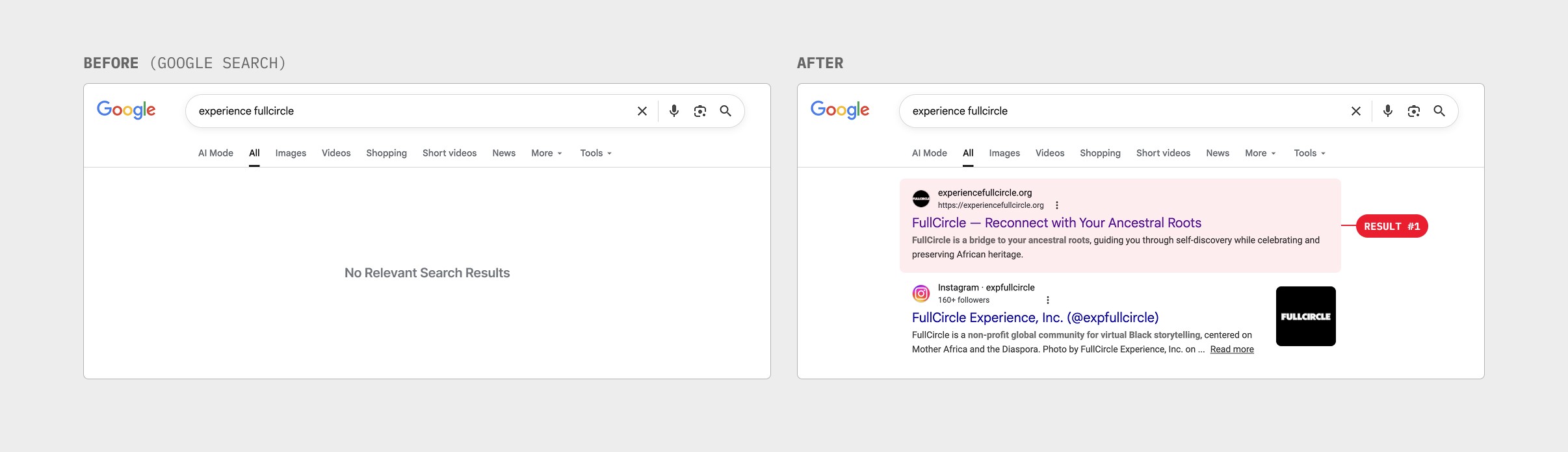 Before the redesign, the website did not appear within the first 10 pages of Google results for "FullCircle Experience."